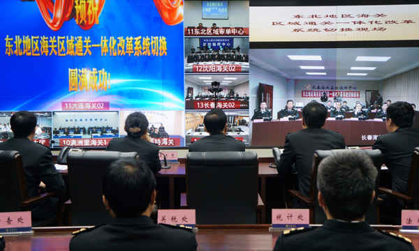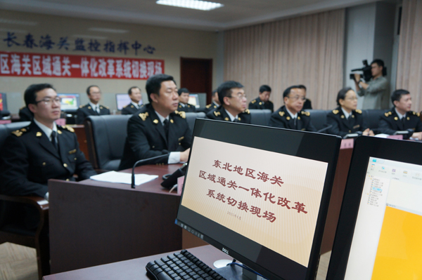 4月26日零时,在长春海关监控指挥中心,随着长春海关监管通关处处长聂晓山向东北地区海关区域通关一体化改革总指挥部报告:“长春海关区域通关一体化改革系统测试成功!”,标志着这项经东北四省区6个海关历时1个半月共同奋战下的东北地区海关区域通关一体化改革初战告捷。