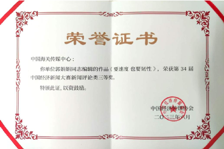 郭娟娟作品《要速度 也要韧性》获第34届中国经济新闻大赛新闻评论类三等奖。