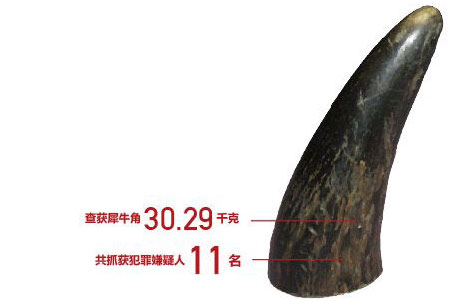 2018年1月19日,广州海关缉私局破获“1.19”犀牛角走私系列案,抓获犯罪嫌疑人6名,查获犀牛角25.95千克。同年2月25日,经深挖扩线,在珠海将正在交易走私进境犀牛角的5名犯罪嫌疑人抓获,查获犀牛角4.34千克。该系列案共计抓获犯罪嫌疑人11名,查获犀牛角30.29千克。