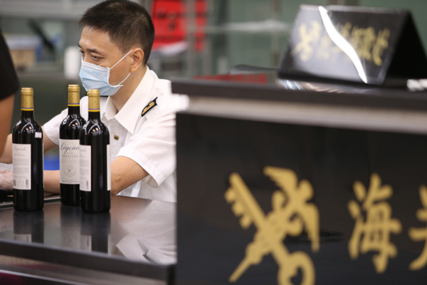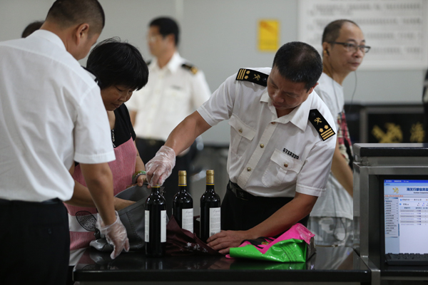 图为:拱北口岸封闭区内关员按规定处理旅客违规超带的红酒 王震/摄